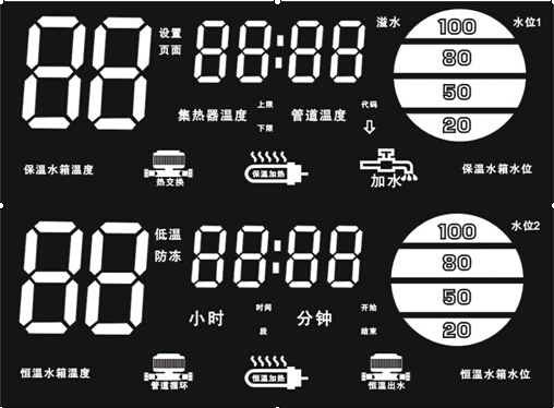 1、 超大LED集成顯示:集熱器溫度、保溫溫度、管道溫度、保溫水位、恒溫水箱溫度、恒溫水箱水位、低溫溫度、顯示北京時間及工作狀態(tài),系統(tǒng)運(yùn)行時一目了然;