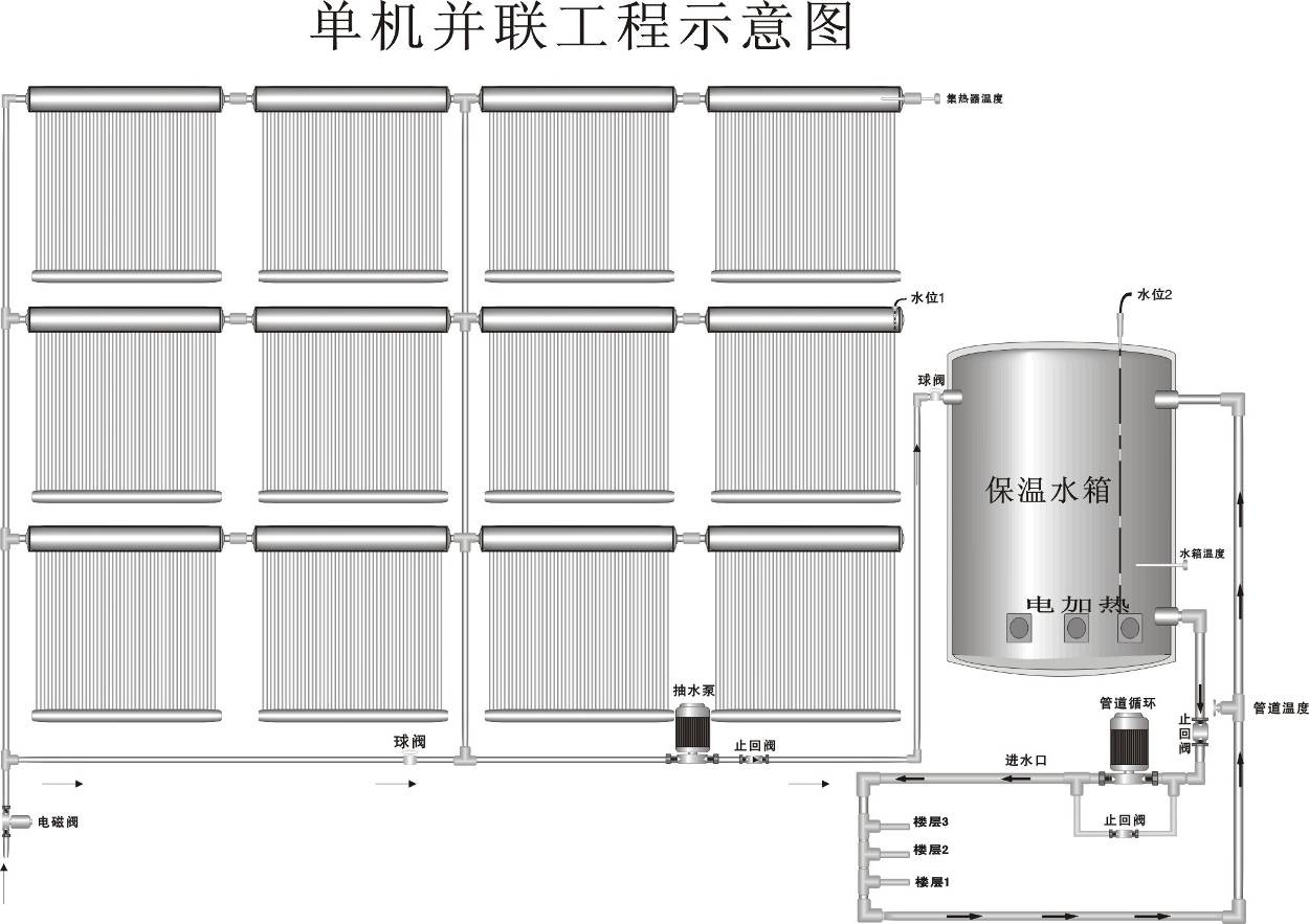 太陽能熱水器工程 單機(jī)并聯(lián)太陽能熱水器工程示意圖